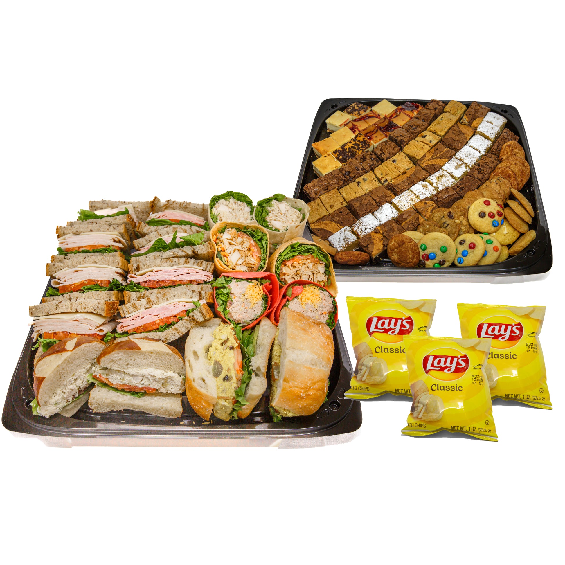 Sandwich & wrap tray with chips and our homemade cookies and bar desserts.