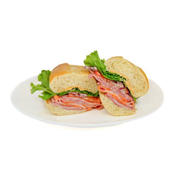 Ham, Genoa salami, capicola, lettuce, tomato, onions and roasted red pepper aioli on a hoagie roll