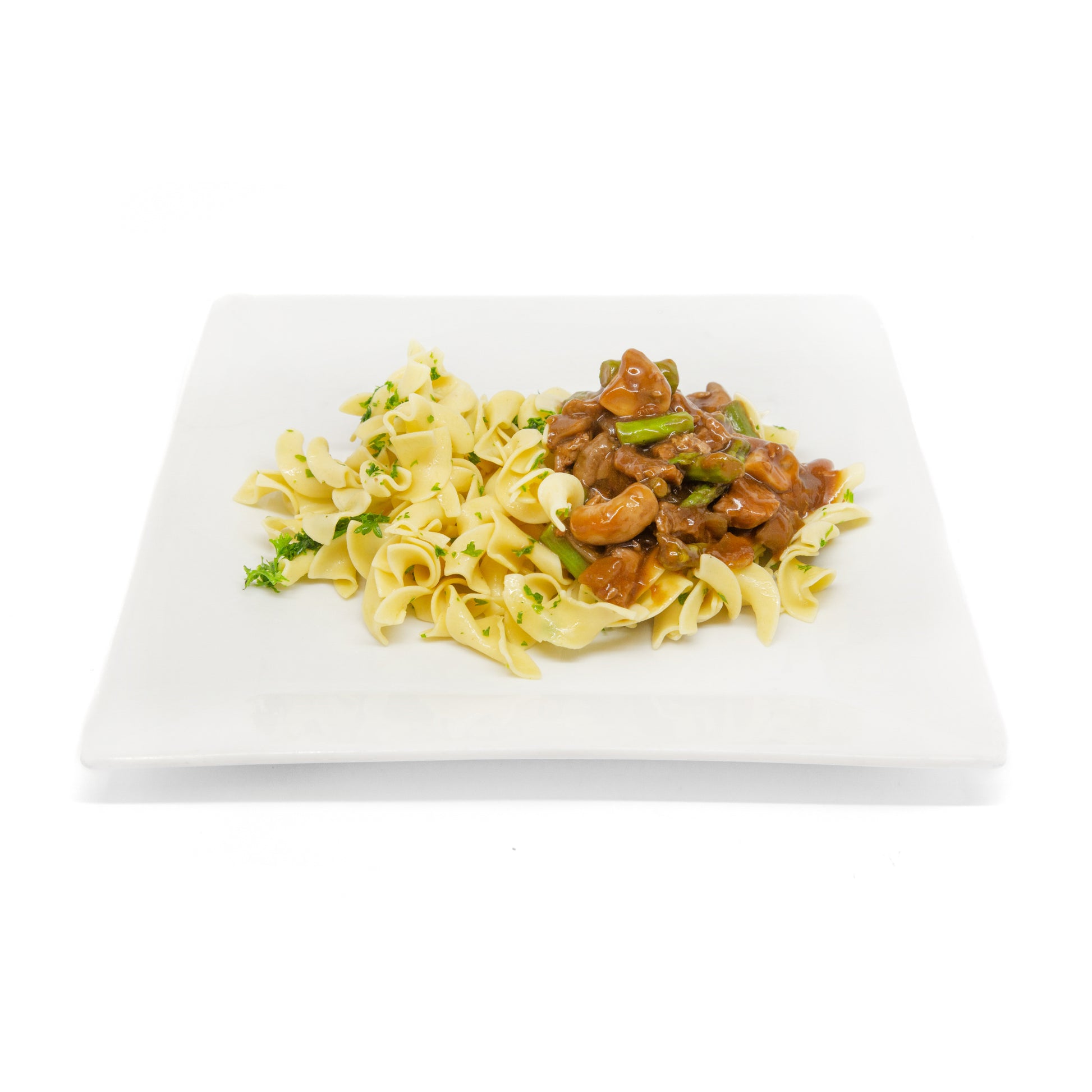 Tenderloin Tips Simmered in a Rich Wine Sauce Mixed with Wild Mushrooms and Asparagus, Served Over Egg Noodles