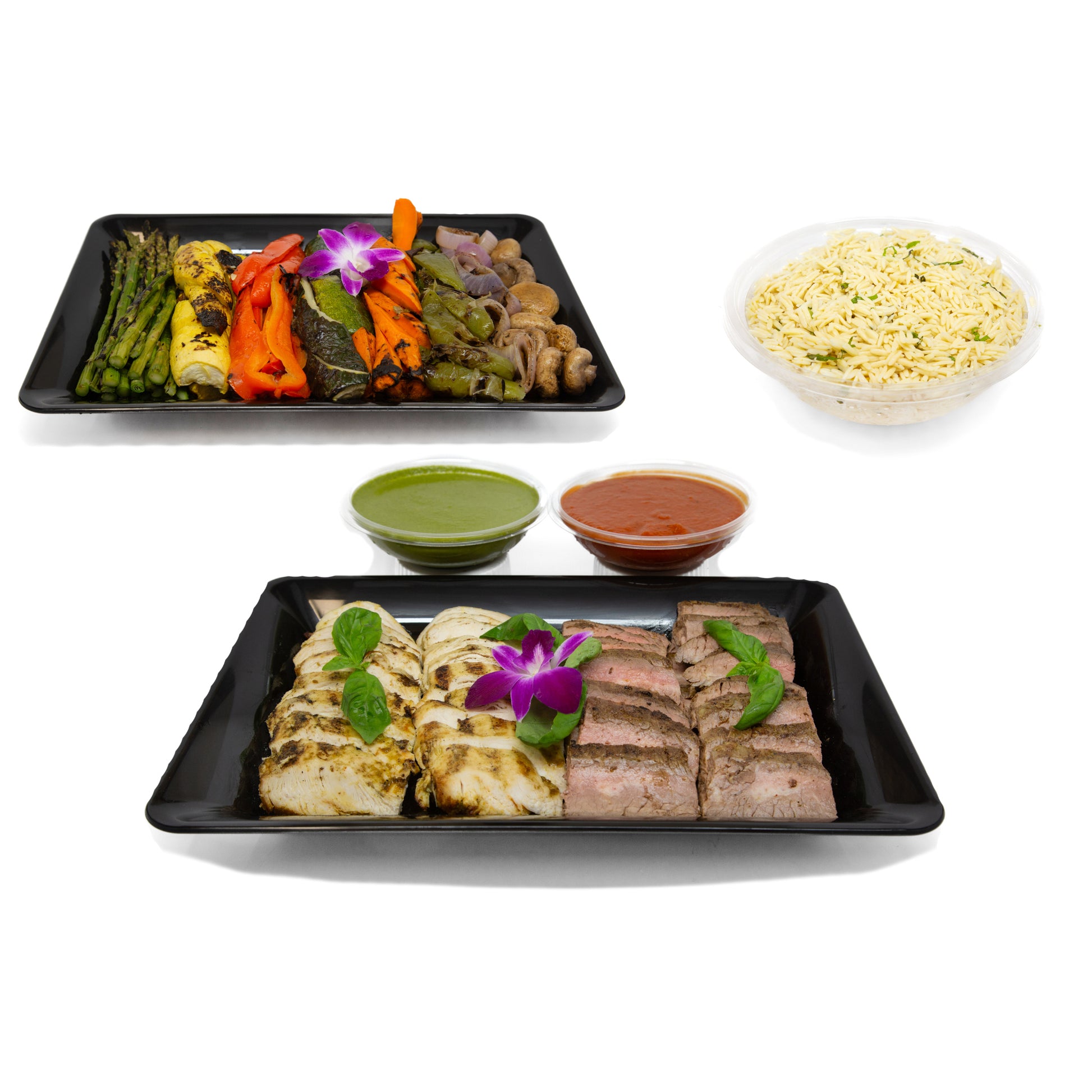 Grilled marinated flank steak and fire roasted chicken breast with chimichurri sauce, served with lemon orzo and grilled vegetables; mini cookies & bars. Add salmon or shrimp $5.00.