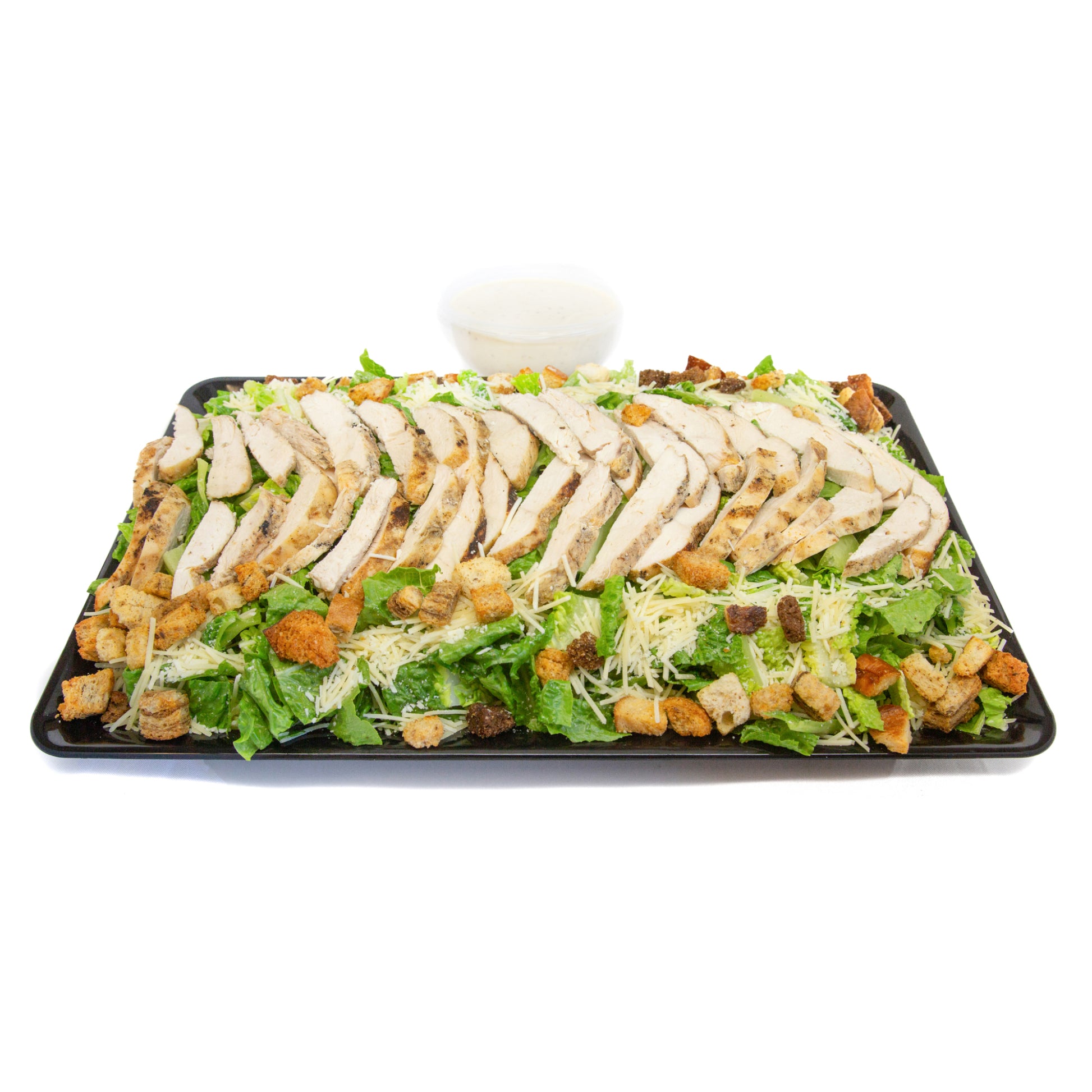 Serves 10. Strips of grilled chicken breast fanned on our traditional Caesar salad with  homemade croutons, parmesan cheese, and caesar salad dressing / with flank  steak add $32 / with salmon, add $40.