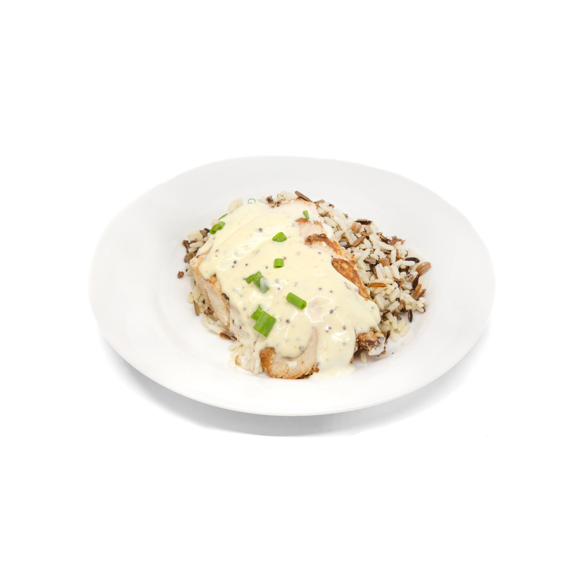 Tender Baked Chicken Breast with a Grain Mustard Cream Sauce, Served with Wild and White Rice Mix