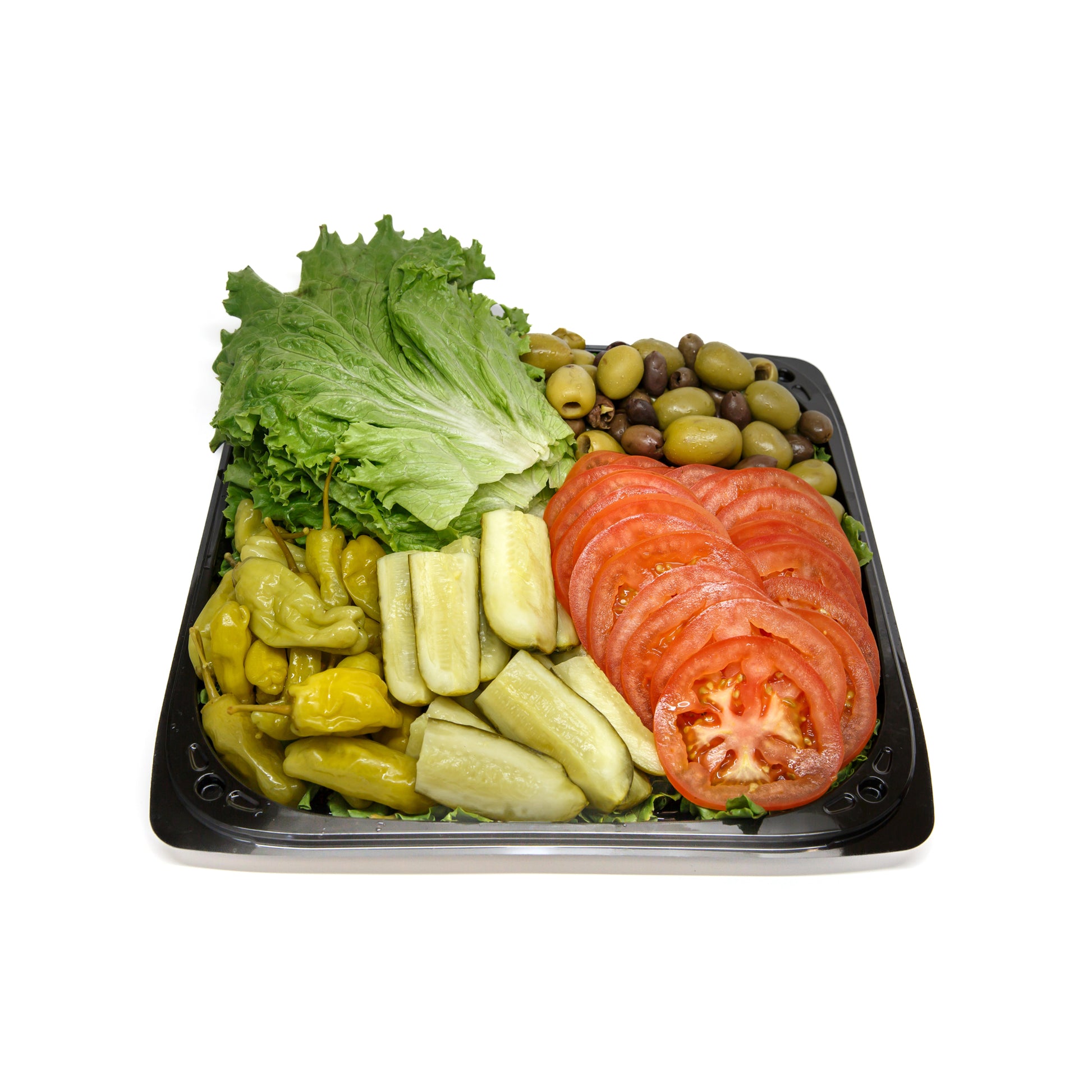 Make your own – an assortment of sliced New York-style deli meats and cheeses with bread and rolls and a tray of lettuce, tomatoes, olives, pickles, and pepperoncini. Served with tri-color pasta primavera, fresh fruit salad, and  assorted mini cookies