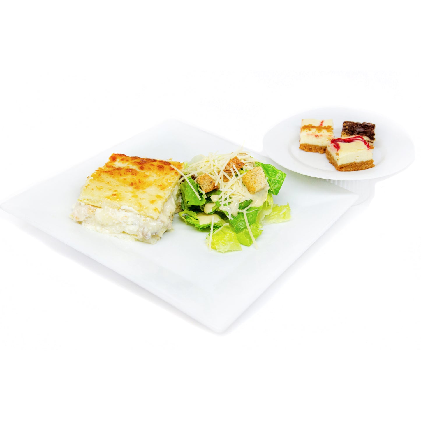 Beef and ricotta lasagna, Caesar salad, garlic bread and cheesecake squares; also available: chicken lasagna and vegetarian white lasagna.