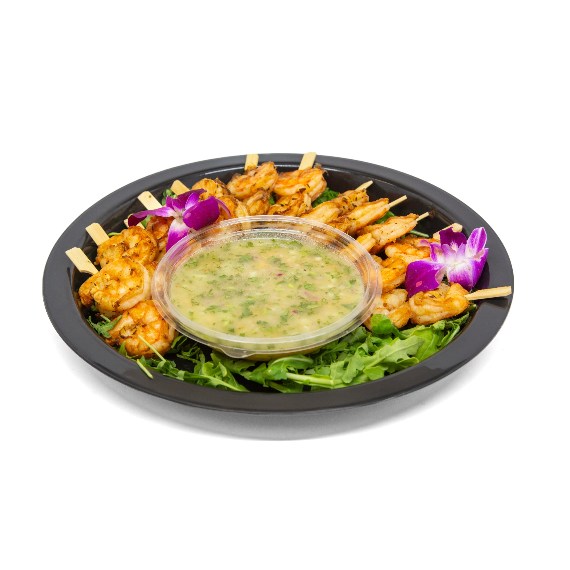 Grilled shrimp rubbed in Jamaican jerk spices on skewers. served with a melon  cilantro salsa