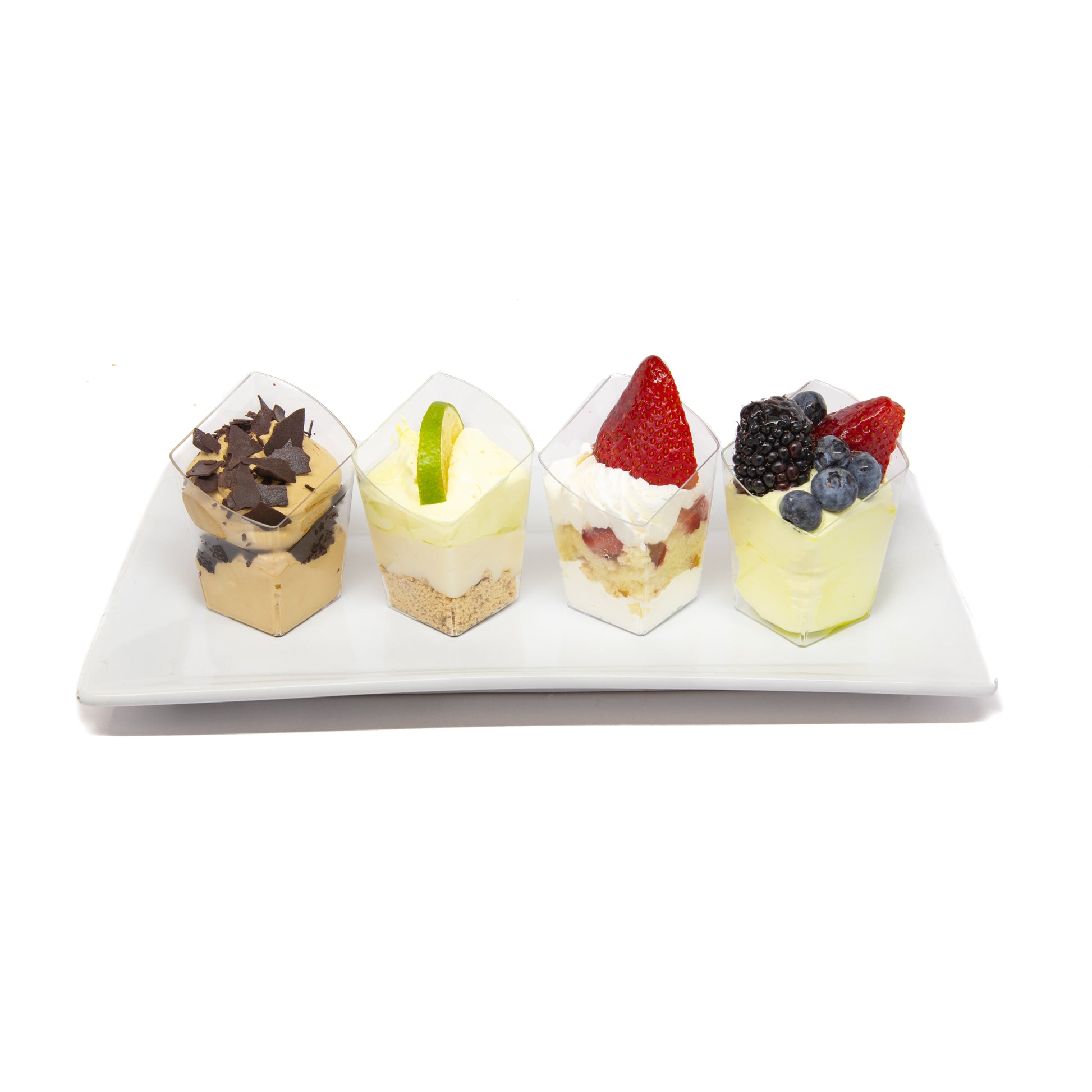 Shot glasses of lemon cloud mousse, Kahlua mocha trifle, banana cream pie, chocolate mousse, strawberry shortcake, key lime pie, and carrot cake. Min 10 per flavor.