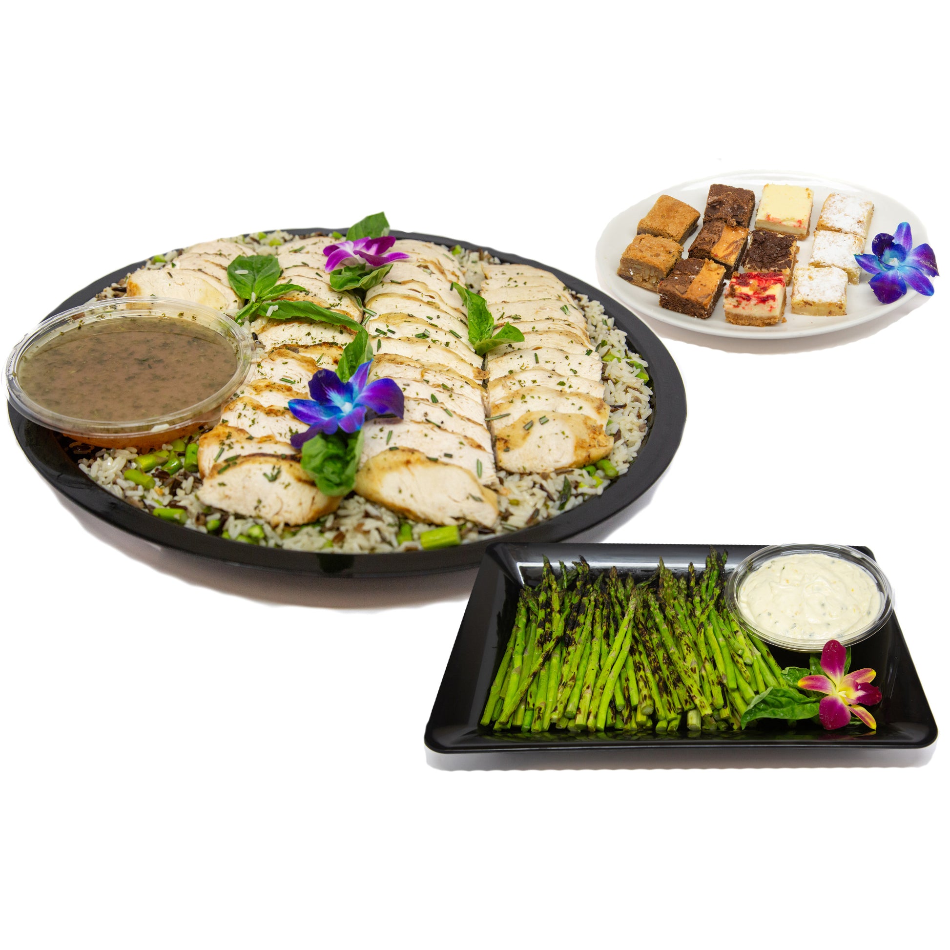 Sliced grilled chicken served atop a bed of herbed wild rice and asparagus with lemon vinaigrette; assorted mini bars.