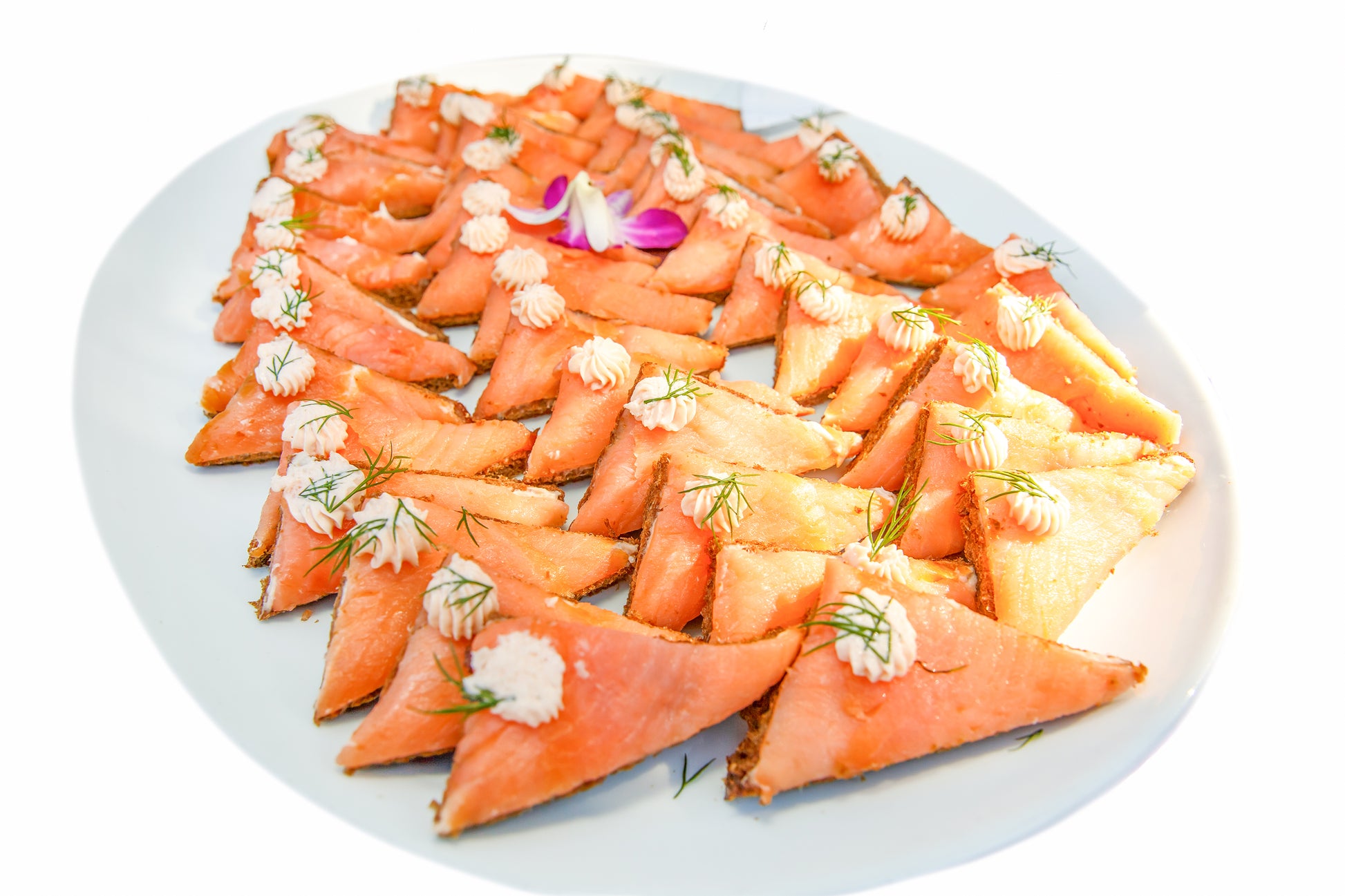 Sliced smoked salmon on brown bread, topped with dill creme fraiche