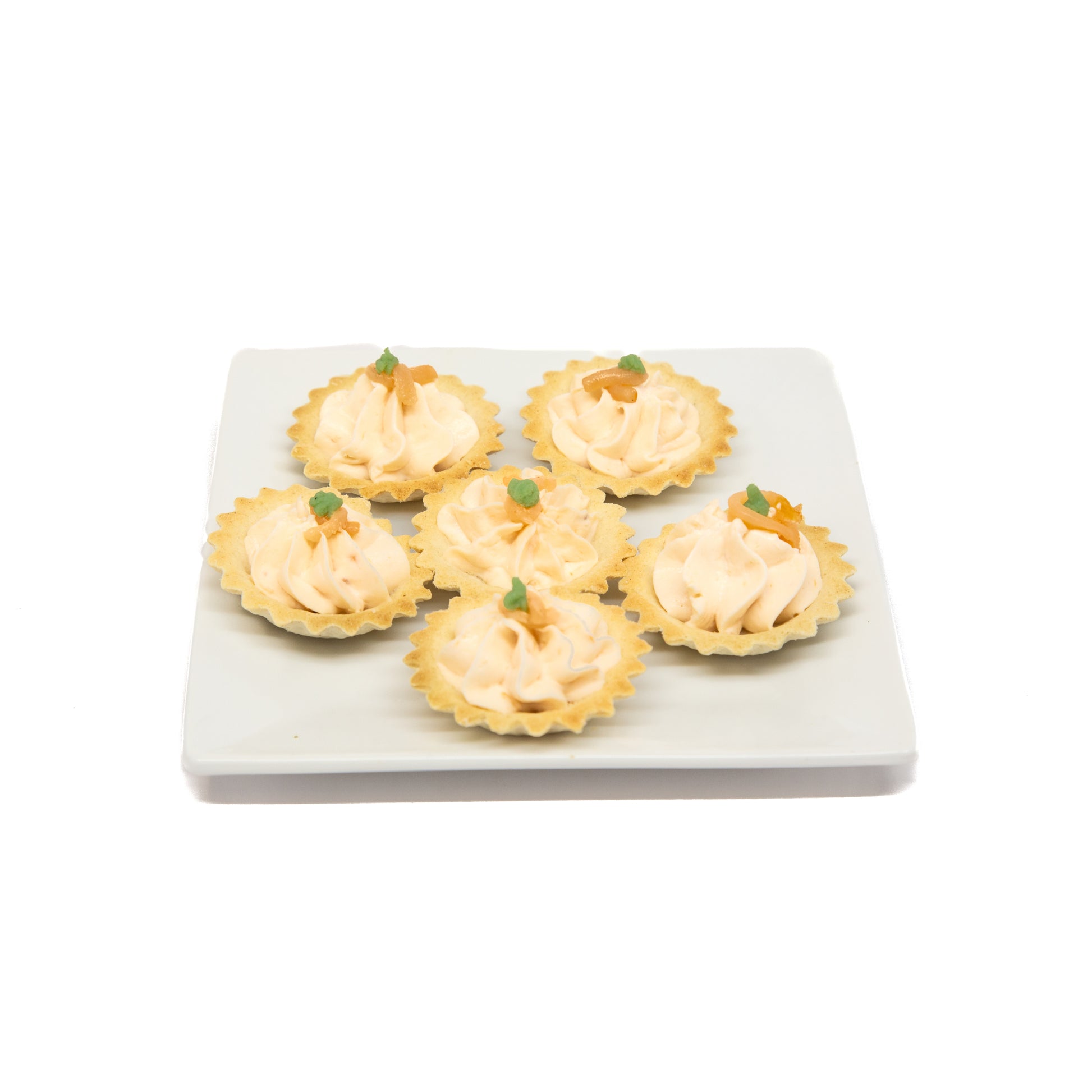 Mini pastry shells, filled with smoked salmon mousse with a hint of wasabi.